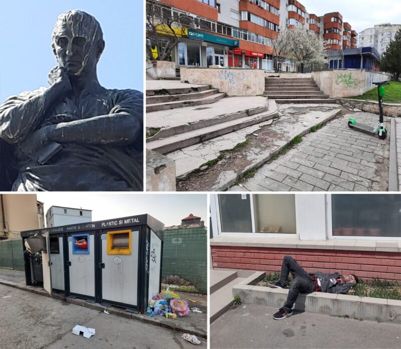 * Orașul flegmelor, cojilor de semințe, chiștoacelor de țigări, pet-urilor și pungilor/ sacoșelor din plastic aruncate pe străzi, trotuare, alei, spații verzi,