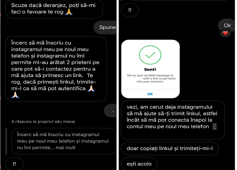 Odată ce primești mesajul menționat anterior, el va face o solicitare de resetare a parolei contului dumneavoastră, nu contului său. Ulterior vă va solicita codul pe care l-ați primit prin SMS iar în câteva secunde parola va fi resetată și contul dumneavoastră va trimite aceleași mesaje cu scopul furtului în masă si a altor conturi.