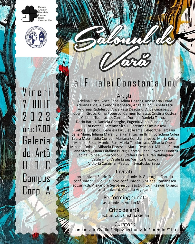 Universitatea Ovidius din Constanța (UOC) organizează vineri, 7 iulie 2023, la ora 17.00, vernisajul Salonului de Vară al Filialei Constanța Unu a Uniunii Artiștilor Plastici din România. Evenimentul va avea loc la Galeria de Artă a UOC, aflată la parterul corpului A din campusul universitar (Aleea Universității, nr.1).