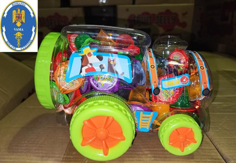 În data de 31 octombrie 2023, inspectorii vamali din cadrul Biroului Vamal de Frontieră Constanța Sud – Direcția Regională Vamală București, au descoperit într-un container sosit din China, având ca destinație o societate comercială cu sediul în București, 3.444 cutii conținând fiecare 100 bucăți jeleuri din fructe, bunuri susceptibile a aduce atingere dreptului de proprietate intelectuală pentru mărcile Disney și Thomas.