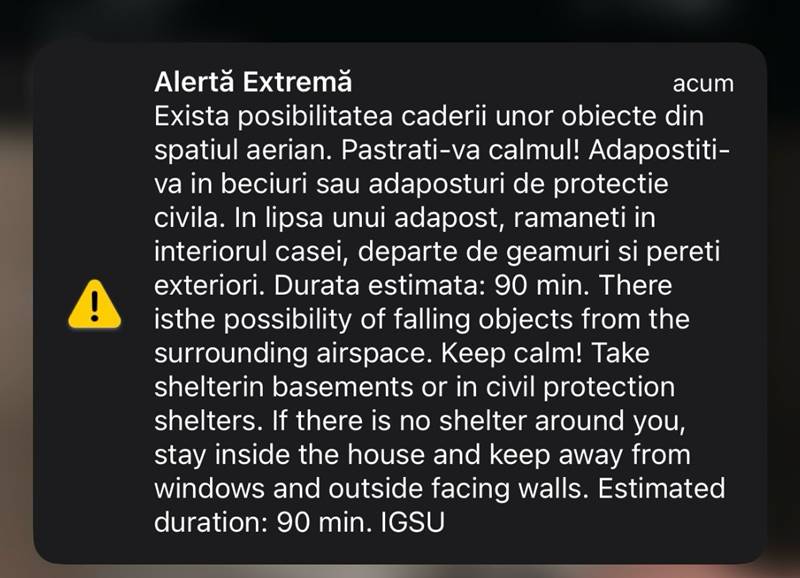 În urmă cu puțin timp a fost trimis un mesaj RO-alert prin care populația din nordul județului Tulcea, mai exact 16 comune și municipiul Tulcea, a fost avertizată despre posibilitatea căderii unor obiecte din spațiul aerian, transmit reprezentanții ISU Tulcea.