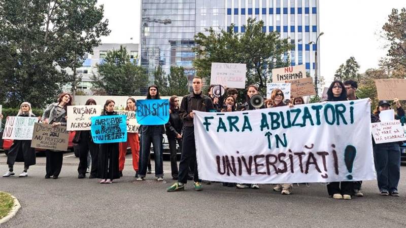 Aproximativ 25 de tineri au protestat la deschiderea anului universitar la SNSPA. Imaginile filmate de jurnalista Ioana Moldoveanu de la Snoop.ro arată studenţii care ţin pancarte cu mesaje precum „Fără abuzatori în universități!” și „SNSPA, nu uita, abuzul e și vina ta”.