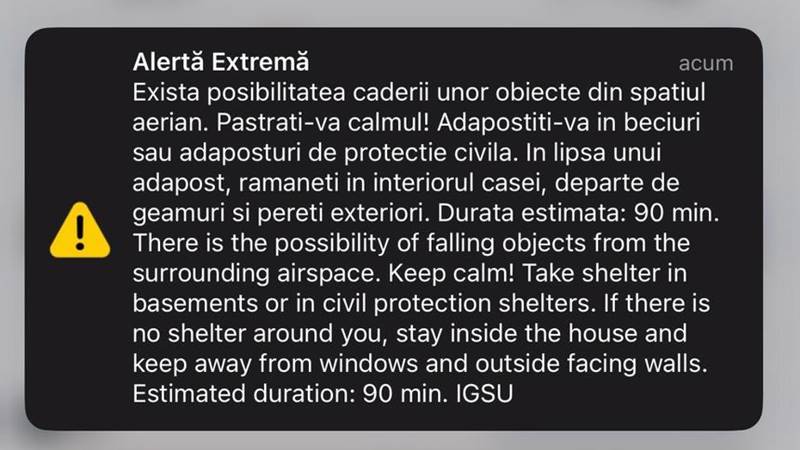 În urmă cu scurt timp, Inspectoratul General pentru Situaţii de Urgenţă a emis un mesaj de tip RO-Alert pentru zona de Nord a judeţului Tulcea prin care informează locuitori despre posibilitatea căderii unor obiecte din spaţiul aerian. Acest mesaj este trimis după ce structurile cu rol de apărare a frontierelor au detectat posibile ţinte în apropiere de graniţele României”, a transmis ISU Tulcea.