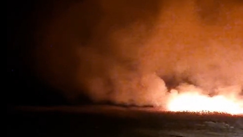 Pompierii supraveghează incendiul pentru a evita răspândirea acestuia la o fermă de animale din apropiere și la un depozit de baloți de paie.
