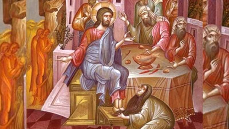 Când Iisus S-a suit în Ierusalim în casa lui Simon leprosul, o femeie păcătoasă s-a apropiat de El. Și a turnat pe capul Lui acel mir de mare preț, în valoare cam de trei sute de dinari. Ucenicii, dar mai ales Iuda, au certat-o. Hristos însă i-a luat apărarea ca să nu îndepărteze gândul ei cel bun. Pe urmă Hristos face pomenire de îngroparea Sa spre a întoarce pe Iuda de la vânzare. Și a învrednici pe femeie de marea cinste de a se propovădui pretutindeni, în toată lumea, fapta ei bună.