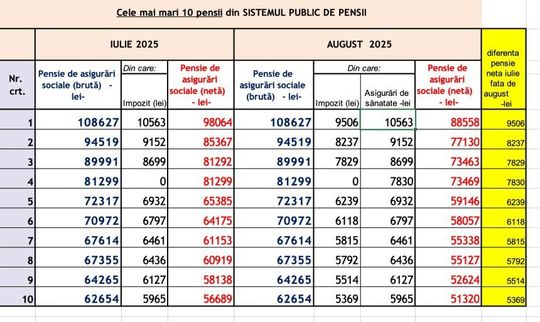 A doua pensie ca valoare netă în România ajungea, în luna iulie, la valoarea de 85.367 lei (puţin peste 17.000 de euro). De la 1 august, valoarea pensiei s-a diminuat cu aproximativ 1.650 de euro, ajungând la suma de 77.130 de lei net (15.400 de euro). Podiumul celor mai mari pensii din ţară era completat în luna iulie cu suma de 81.292 lei, valoare netă. Altfel spus, 16.250 de euro lunar. După noile taxe impuse de coaliţia de guvernare, pensia a scăzut la 73.463 lei net, aşadar 14.700 de euro lunar.