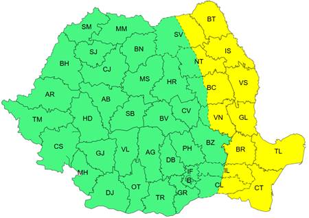 Judeţele marcate cu Cod galben sunt Botoşani, Iaşi, Vaslui, Galaţi, Brăila, Tulcea şi Constanţa, integral, şi Suceava, Neamţ, Bacău, Vrancea, Ialomiţa şi Călăraşi, parţial.
