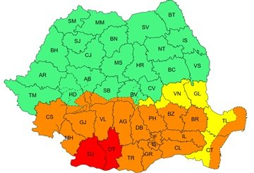 Potrivit ANM, vineri, în intervalul 10.00–21.00, este cod galben în Banat, Crişana, Maramureş, Transilvania, Oltenia, vestul şi centrul Munteniei, Dobrogea şi în zonele de munte